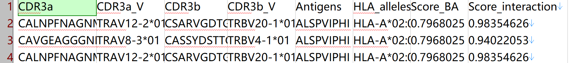 DeepTR_predictions.tsv: result file includes the score of peptide binding to HLA and score of binding between pHLA and TCR.
