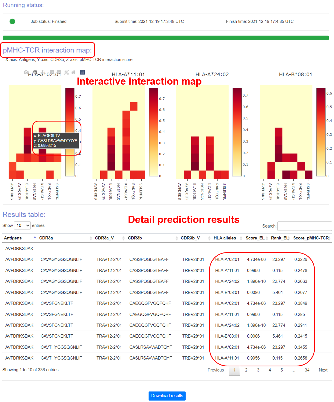 The top ranked interaction between TCR and pMHC in each HLA allele would be visualized in a interactive way on the output page after a few minutes of running time. The whole prediction results, which are well organized in table format, could also be obtained and downloaded.