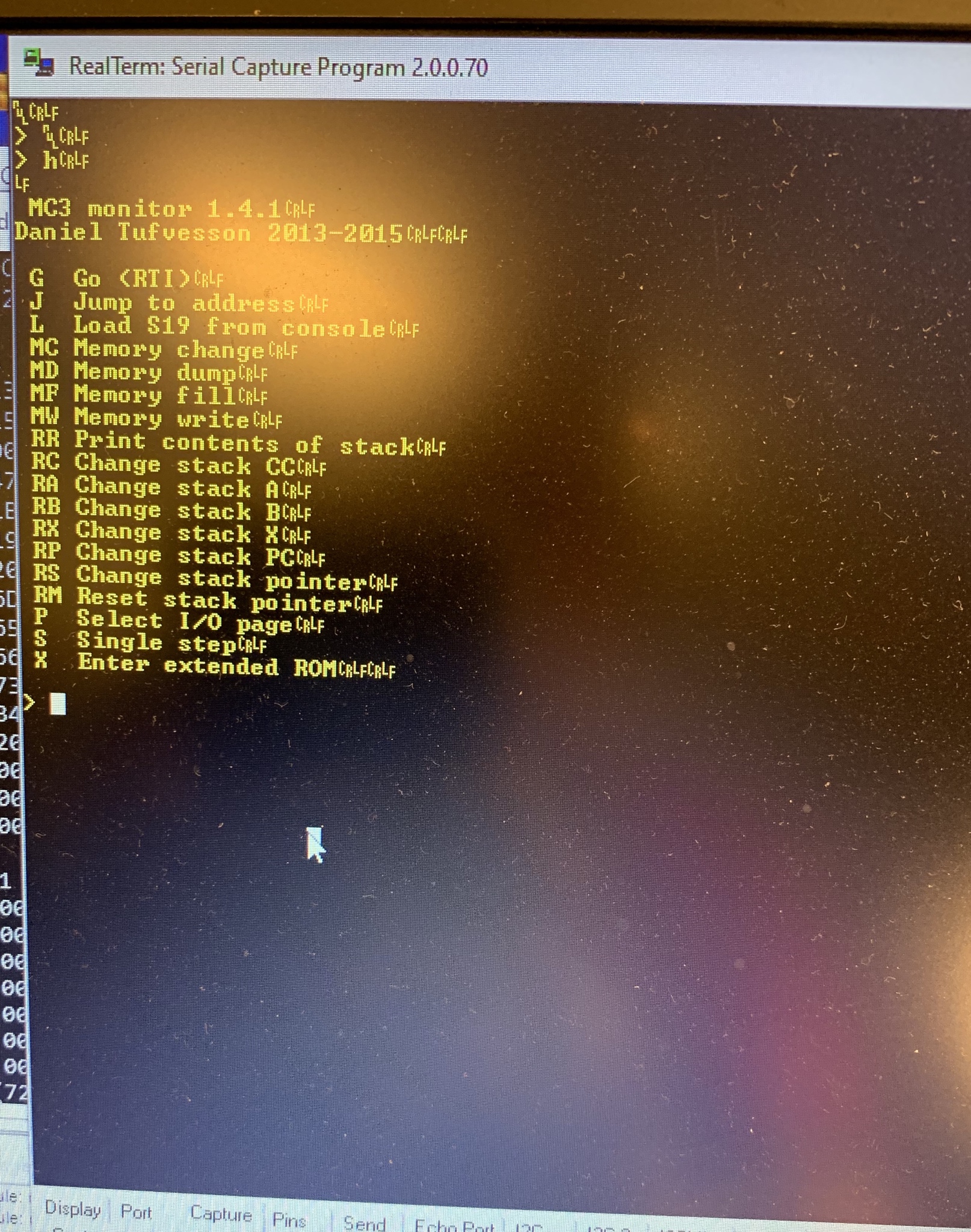 With the baudrate set to 4800 bps a 6803 or a 6801 processor gave us a ">" prompt in response to pressing the reset button. It was working!