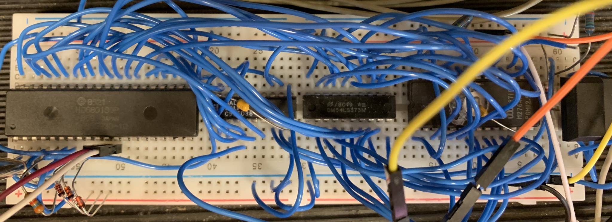 A mockup was created on a breadboard and a small problem was detected in the PLD. New PLD code fixed that problem. It was also detected that 68701 is sufficently different from the 6801 to not work with this circuit. The reason is that the 68701 has the interrupt vectors in a different place when running in mode 0. The 6803, which is the romless variant of the 6801, does work identical to the 6801. As it turns out it works perfectly with the circuit above. One interesting thing is that there actually are ROM content in the ROM which seems to be at least potentially correct. At least the RESET vector is in the correct spot! So it seems the 6803 is just 6801 chips which has been discarded due to bad firmware!?