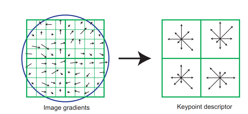 The local image gradients are measured at the selected scale in the region around each keypoint. These samples are then accumulated into orientation histograms summarising the contents over 4x4 subregions, as described in the figure, with the length of each arrow corresponding to the sum of the gradient magnitudes near that direction within the region calculated using a Gaussian weighted function. This allows for significant levels of local shape distortion and change in illumination.