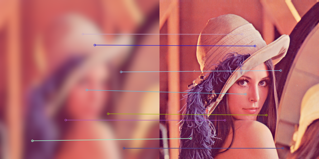 Number of keypoints matched are reduced to 8. These correspond to the largest value maxima and minima in the scale space as smaller value maxima and minima have been eroded due to blurring.