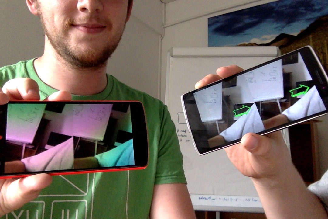 The easy part of this was sending instructions from one client to the other, using Pusher and a simple Node server as a message relay. The hard part was hooking up WebRTC over PeerJS to send the video from client to client.