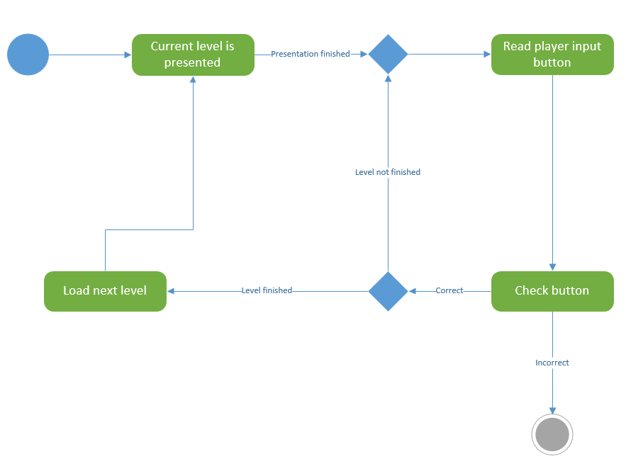 The game uses a random number generation for adding a new pattern each level. This means that each new gameplay will be different. The random number is generated by adding a counter in the wait loop that starts to count from the first button press until the level is done.